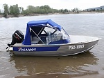 Тент с задней дверью для выхода к мотору, небольшими боковыми окнами и усиленными краями для установки застёжек. Изготовлен из специализированной тентовой ткани Оксфорд 600 повышенной плотности